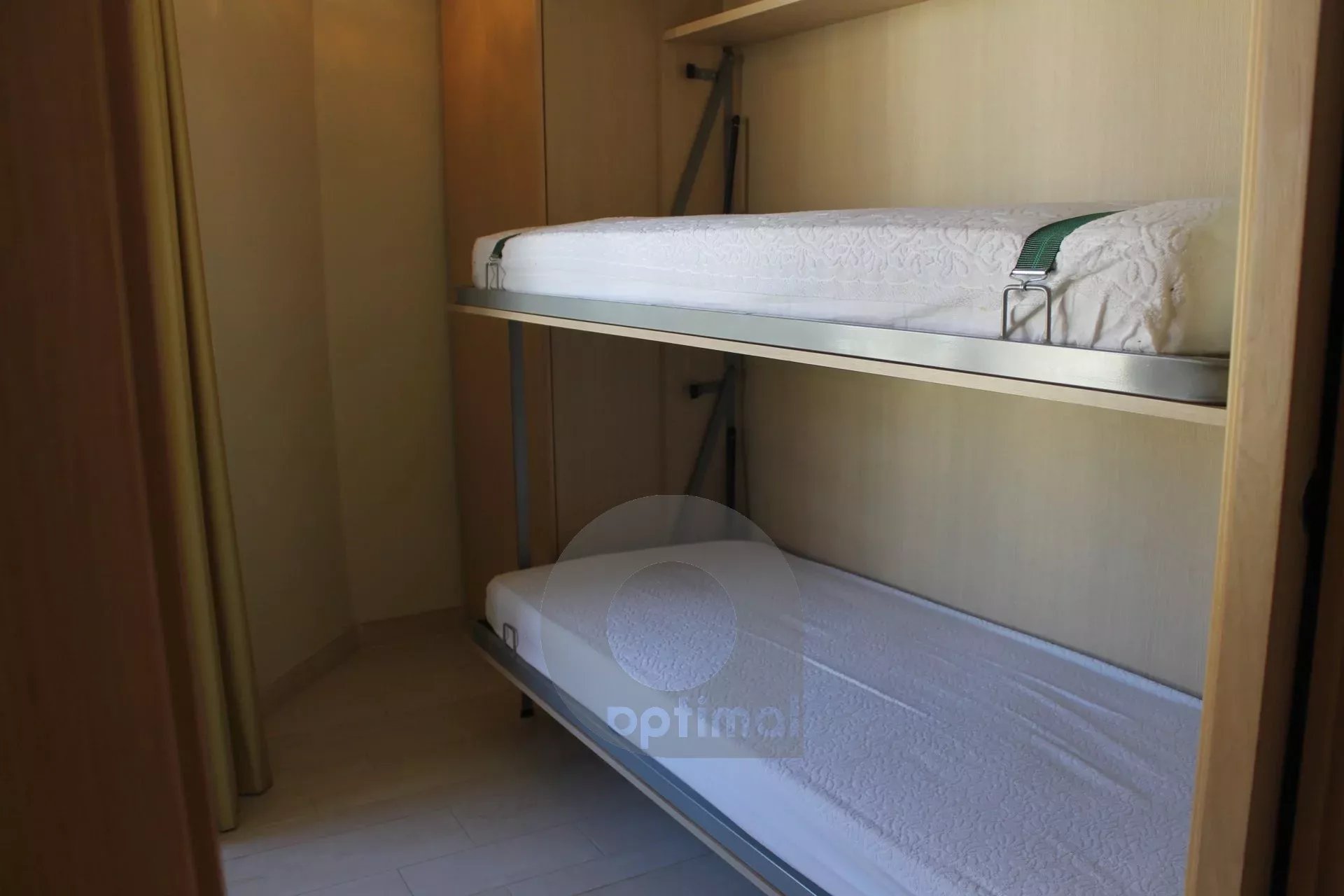 This property consists of an entrance, a living room with a fitted kitchen, a bedroom with a double bed and custom wall closet, a bedroom/study with fold-away bunk beds, a bathroom, a storeroom.
